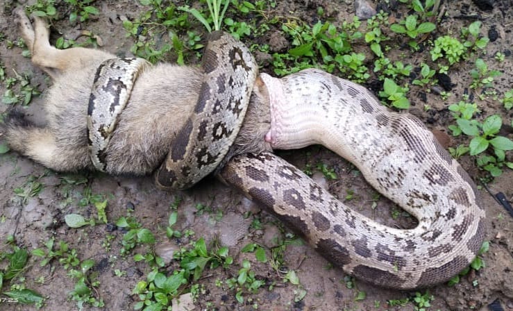 एक 10 फिट लंबा अजगर एक सियार को अपना शिकार बना रहा था