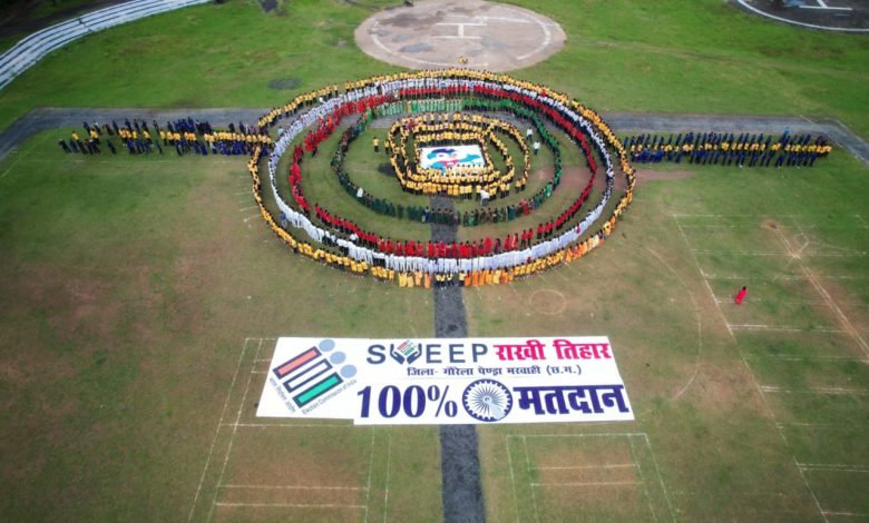 स्वीप कार्यक्रम के तहत हजारों लोगों ने राखी के आकार में मानव श्रृंखला बनाकर शत प्रतिशत मतदान के लिए दिया गया मतदाता जागरूकता का संदेश