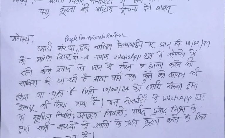AINS NEWS 24×7……एसिड अटैक में घायल एक कुत्ते की मौत हो गई. मामला शहर के अवंती विहार के सेक्टर 2 क्षेत्र में देखने को मिला जिसमें संभ्रांत परिवार के कुछ लोगों ने कुत्तों के ऊपर एसिड डाला और लगतार उनको मारने की प्लानिंग व्हाट्सएप ग्रुप में भी की जा रही है. उन्होंने पहले भी 2 बेजुवान कुत्तों को जहर देकर मारा है. यही नहीं उन्होंने आस पास के सभी लोगों से उन कुत्तो को खाना पानी बंद करने को कहा गया है.
