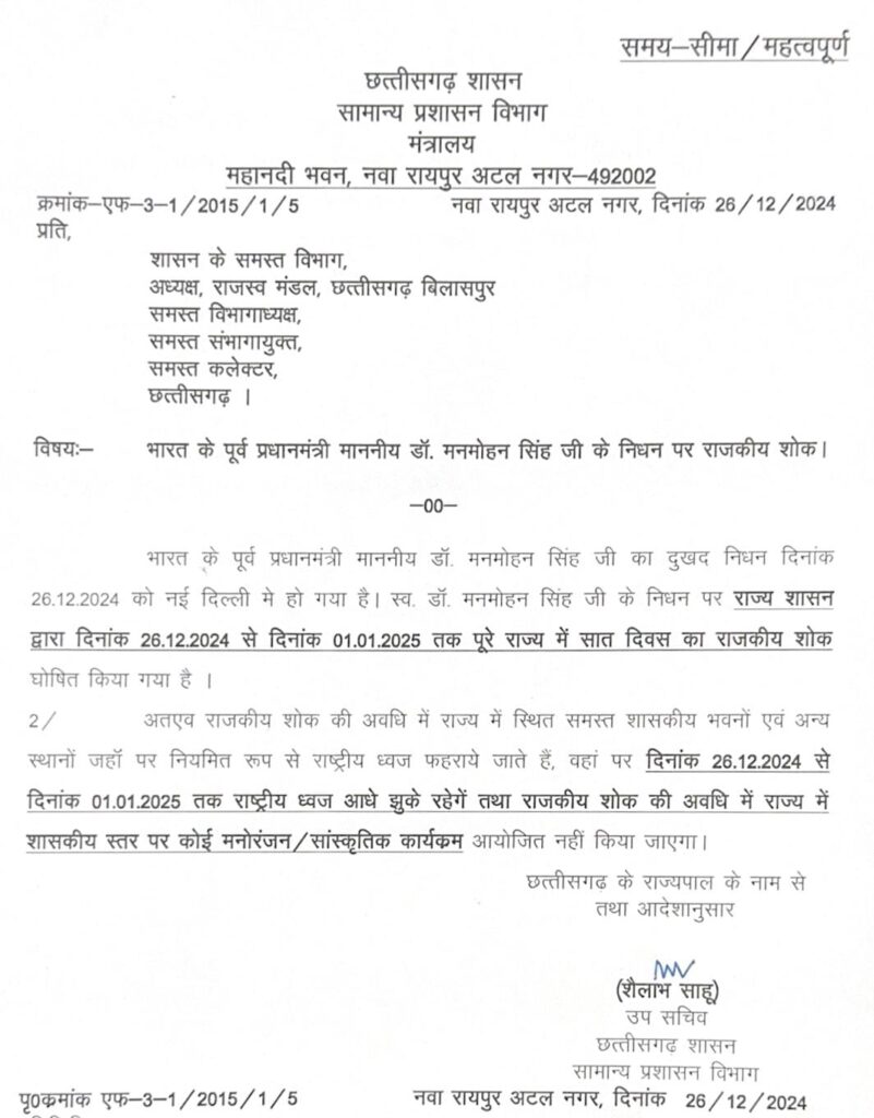 मुख्यमंत्री श्री विष्णु देव साय ने पूर्व प्रधानमंत्री डॉ. मनमोहन सिंह के निधन पर किया दुःख व्यक्त