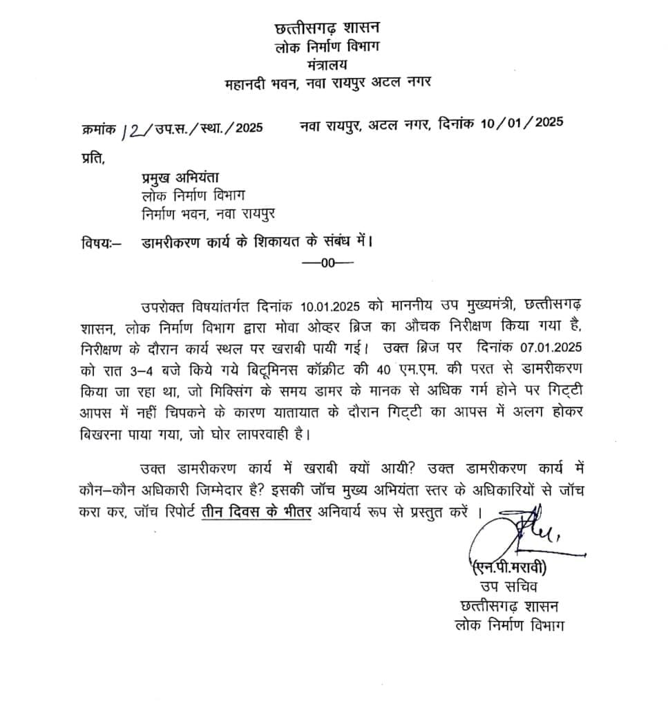 उप मुख्यमंत्री श्री अरुण साव के सख्त निर्देश के बाद लोक निर्माण विभाग ने तत्काल जांच के आदेश जारी कर दिए हैं। विभाग ने मरम्मत में घोर लापरवाही पर डामरीकरण कार्य में खराबी आने के कारण और जिम्मेदार अधिकारी जैसे बिंदुओं की जाँच मुख्य अभियंता स्तर के अधिकारियों से कराकर तीन दिनों में रिपोर्ट अनिवार्य रूप से प्रस्तुत करने को कहा है।