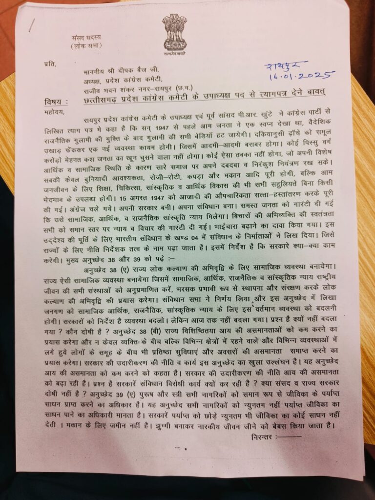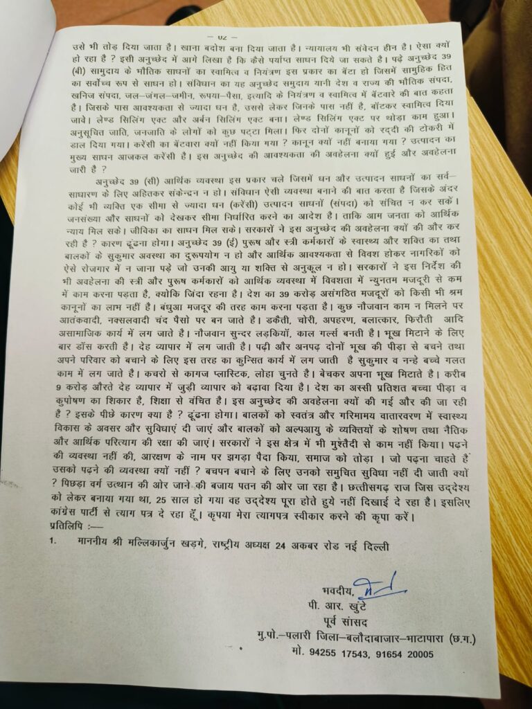 अपने दो पन्ने के पत्र में उन्होंने बहुत सारी बातें लिखी, उन्होंने लिखा कि पिछड़ा वर्ग उत्थान की ओर जाने की बजाय पतन की ओर जा रहा है, छत्तीसगढ़ राज्य जिस उद्देश्य को लेकर बनाया गया था 25 साल बाद भी वह उद्देश्य पूरा होते नहीं दिखाई दे रहा है इसलिए मैं कांग्रेस पार्टी से त्यागपत्र दे रहा हूं, कृपया मेरा त्यागपत्र स्वीकार करने की कृपा करें।