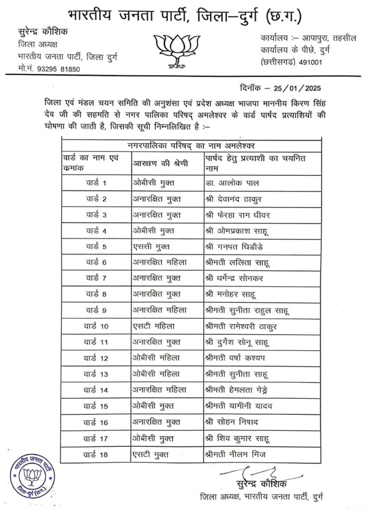 अमलेश्वर नगर पालिका परिषद के सभी 18 वार्डों में भाजपा ने अपने प्रत्याशी किए घोषित