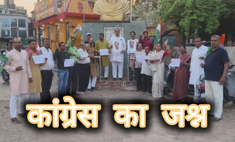 कांग्रेस भवन गांधी मैदान के सामने कांग्रेस के नेताओं ने आतिशबाजिया कर एक दूसरे को मिठाई खिलाई,