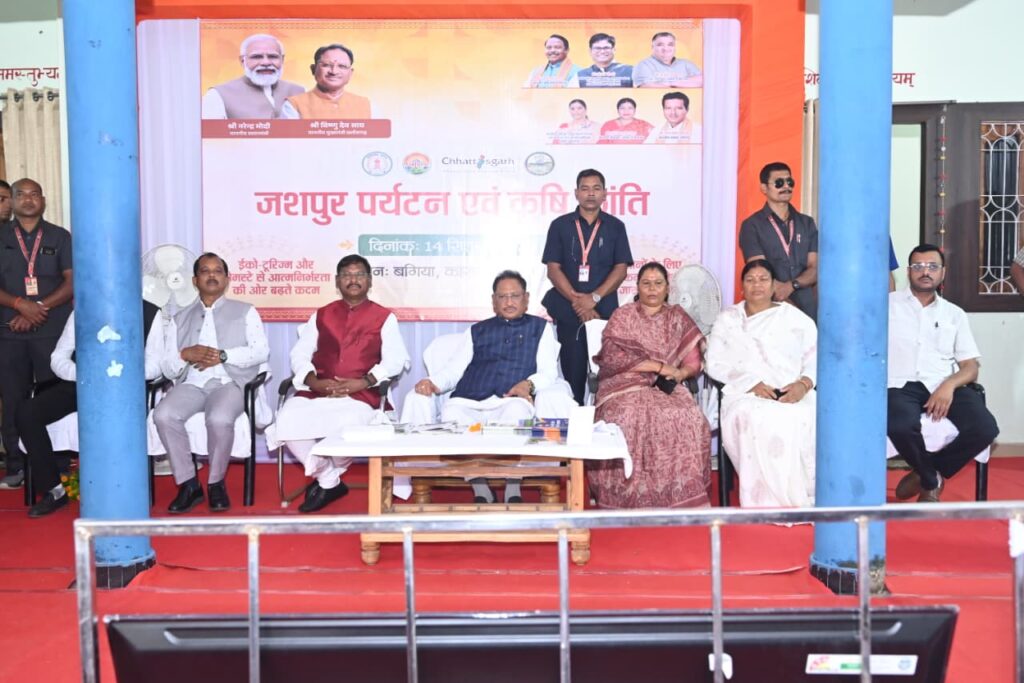 AINS NEWS… मुख्यमंत्री श्री विष्णु देव साय ने आज रविवार को मुख्यमंत्री कैम्प कार्यालय बगिया में पर्यटन एवं कृषि क्रांति का शुभारंभ किया। जशपुर पर्यटन एवं कृषि क्रांति इको टूरिज्म और होमस्टे से आत्मनिर्भरता की ओर बढ़ते कदम जशपुर के स्व सहायता समूह और किसानों को इसका प्रत्यक्ष लाभ मिलेगा। इस अवसर पर झारखंड सरकार के पूर्व मुख्यमंत्री श्री अर्जुन मुंडा, सरगुजा आदिवासी विकास प्राधिकरण की उपाध्यक्ष और पत्थलगांव विधायक श्रीमती गोमती साय, जशपुर विधायक श्रीमती रायमुनि भगत, जिला पंचायत अध्यक्ष श्री सालिक साय, कलेक्टर श्री रोहित व्यास, एस एस पी श्री शशि मोहन सिंह, जिला पंचायत सीईओ श्री अभिषेक कुमार, सुनील गुप्ता, मुकेश शर्मा सहित जनप्रतिनिधिगण और बड़ी संख्या में आम नागरिक उपस्थित थे।