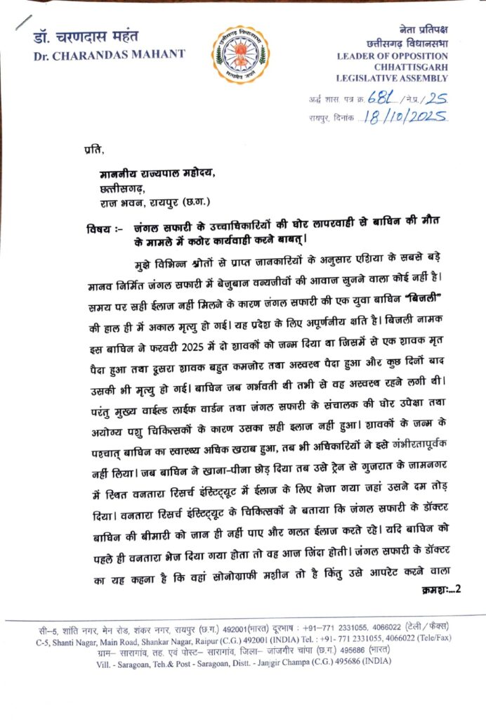AINS NEWS… छत्तीसगढ़ विधानसभा नेता प्रतिपक्ष डॉ. चरणदास महंत ने कहा कि, मुझे विभिन्न श्रोतों से प्राप्त जानकारियों के अनुसार एशिया के सबसे बड़े मानव निर्मित जंगल सफारी में बेजुबान वन्यजीवों की आवाज सुनने वाला कोई नहीं है। समय पर सही ईलाज नहीं मिलने के कारण जंगल सफारी की एक युवा बाघिन ”बिजली“ की हाल ही में अकाल मृत्यु हो गई। यह प्रदेश के लिए अपूर्णनीय क्षति है। बिजली नामक इस बाघिन ने फरवरी 2025 में दो शावकों को जन्म दिया था जिसमें से एक शावक मृत पैदा हुआ तथा दूसरा शावक बहुत कमजोर तथा अस्वस्थ पैदा हुआ और कुछ दिनों बाद उसकी भी मृत्यु हो गई।