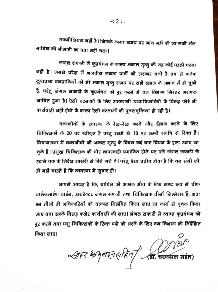 डॉ. महंत ने कहा कि, वन्यजीवों के स्वास्थ्य के देख-रेख करने और ईलाज करने के लिए चिकित्सकों के 20 पद स्वीकृत है परंतु इसमें से 18 पद लम्बी अवधि से रिक्त हैं। विधानसभा में वन्यजीवों की अकाल मृत्यु के विषय कई बार विपक्ष के द्वारा उठाए जा चुके हैं। प्रमुख चिकित्सक की घोर लापरवाही प्रमाणित होने पर उसे जंगल सफारी से हटाने तक के निर्देश आसंदी से दिये गये थे। परंतु ऐसा प्रतीत होता है कि वन मंत्री जी ही नहीं चाहते हैं कि व्यवस्था में सुधार हो। बाघिन की अकाल मौत के लिए स्पष्ट रूप से चीफ वाईल्डलाईफ वार्डन, डायरेक्टर जंगल सफारी तथा चिकित्सक तीनों जिम्मेदार हैं, इन तीनों ही अधिकारियों को तत्काल निलंबित किया जाए या कार्य से पृथक किया जाए तथा इनके विरूद्ध कठोर कार्यवाही की जाए। जंगल सफारी मे व्याप्त कुप्रबंधन को दूर करने तथा पशु चिकित्सकों के रिक्त पदों को भरने के लिए वन विभाग को निर्देशित किया जाए।