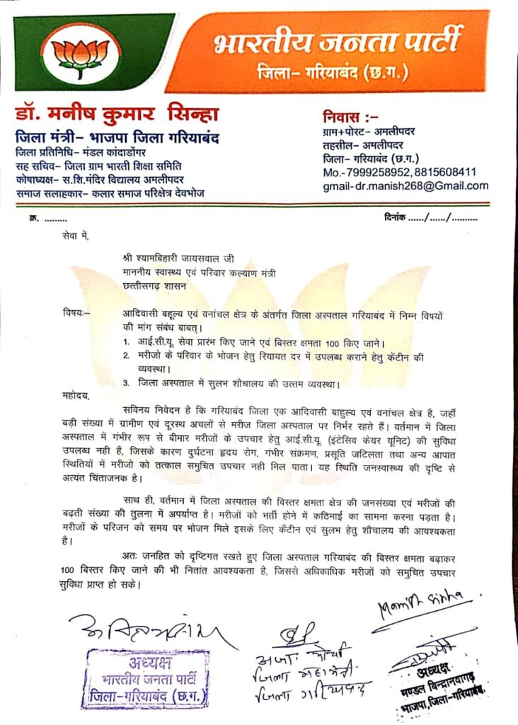 भेंट के दौरान गरियाबंद जिला अस्पताल के समग्र विकास का मुद्दा प्रमुखता से उठाया गया। प्रतिनिधिमंडल ने बताया कि आदिवासी एवं वनांचल क्षेत्र होने के कारण बड़ी संख्या में ग्रामीण एवं दूरस्थ अंचलों के मरीज जिला अस्पताल पर निर्भर हैं, किंतु वर्तमान 50 बिस्तरों की क्षमता क्षेत्र की आवश्यकताओं के अनुरूप नहीं है। इस पर अस्पताल की क्षमता बढ़ाकर 100 बिस्तर किए जाने की जोरदार मांग रखी गई, ताकि मरीजों को समय पर भर्ती और समुचित उपचार मिल सके। साथ ही आपातकालीन चिकित्सा सेवाओं को सुदृढ़ करने हेतु इमरजेंसी केयर आईसीयू (Emergency Care ICU) की स्थापना का विषय भी विस्तार से रखा गया। प्रतिनिधिमंडल ने तर्क दिया कि आईसीयू सुविधा उपलब्ध होने से गंभीर दुर्घटना, हृदय रोग, संक्रमण और अन्य जटिल मामलों में मरीजों को तत्काल उपचार मिल सकेगा और उन्हें रायपुर अथवा अन्य बड़े शहरों में रेफर करने की मजबूरी कम होगी।