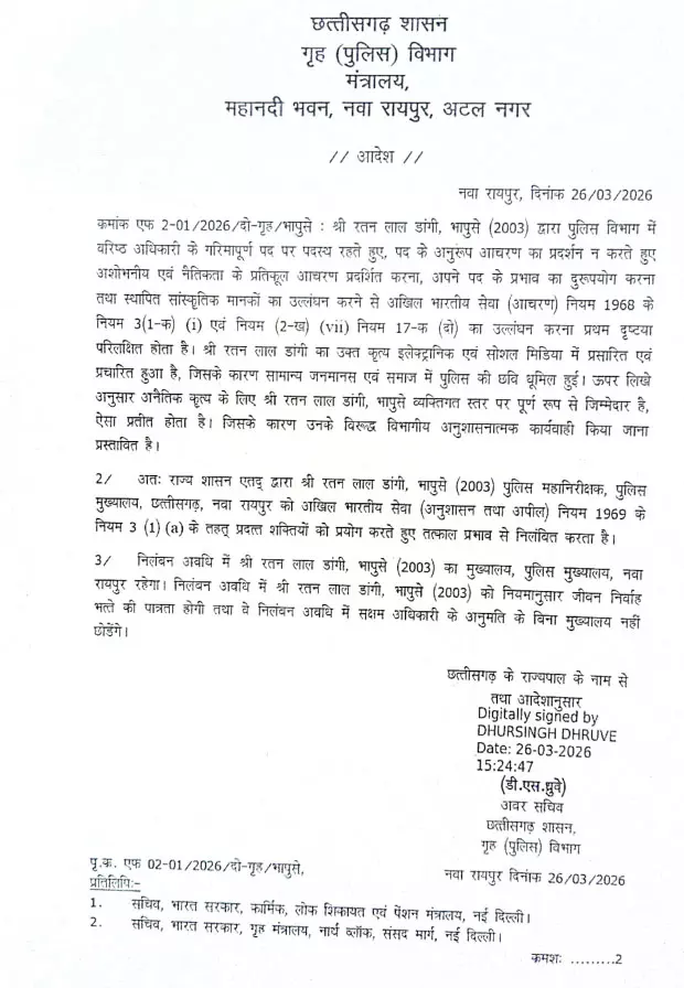 अतः राज्य शासन एतद् द्वारा रतन लाल डांगी, भापुसे (2003) पुलिस महानिरीक्षक, पुलिस मुख्यालय, छत्तीसगढ़, नवा रायपुर को अखिल भारतीय सेवा ( अनुशासन तथा अपील) नियम 1969 के नियम 3 (1) (a) के तहत प्रदत्त शक्तियों को प्रयोग करते हुए तत्काल प्रभाव से निलंबित करता है।निलंबन अवधि में रतन लाल डांगी, भापुसे (2003) का मुख्यालय, पुलिस मुख्यालय, नवा रायपुर रहेगा।