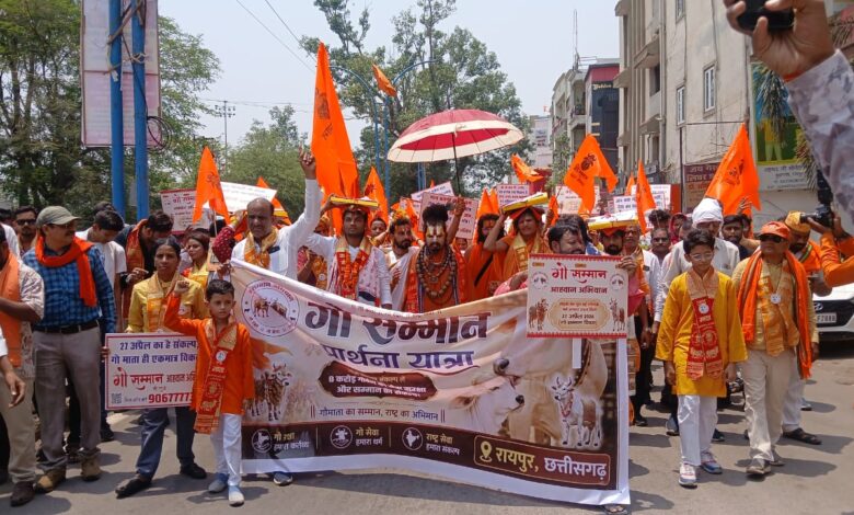 AINS NEWS… रायपुर में “गो सम्मान आह्वान अभियान” के अंतर्गत विशाल संत समाज, गो सेवकों एवं समाज प्रमुखों द्वारा गो माँ और नंदी बाबा को साथ लेकर एक भव्य एवं शांतिपूर्ण भजन-कीर्तन प्रार्थना यात्रा का आयोजन किया गया। यह यात्रा माँ महामाया मंदिर प्रांगण से प्रारंभ हुई, जहाँ सभी श्रद्धालुओं एवं संत-महात्माओं ने माँ का आशीर्वाद प्राप्त कर प्रार्थना पत्र के साथ लगभग 21,200 व्यक्तियों द्वारा संकल्पित पत्रकों को लाल वस्त्र में सिर पर धारण कर नंगे पाँव पैदल चलते हुए अभियान का शुभारंभ किया।