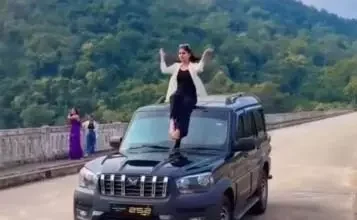 चलती स्कॉर्पियो गाड़ी के ऊपर बैठकर युवती द्वारा खतरनाक स्टंट, वाहन मालिक के खिलाफ कार्रवाई